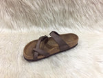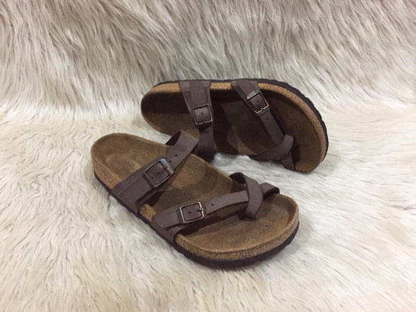 Step into effortless comfort with the Birkenstock Mayari Birko-Flor Sandal in Mocca Brown. Designed with the brand’s signature contoured cork-latex footbed, it provides exceptional support and promotes natural foot alignment. The Birko-Flor upper, a durable and skin-friendly synthetic material, offers a smooth leather-like finish with soft backing for added comfort. Featuring a toe-loop design and adjustable buckled straps, the Mayari blends everyday wearability with timeless Birkenstock style.