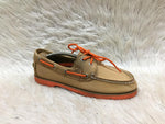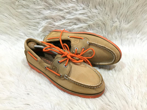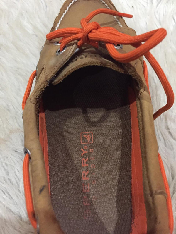 Add a bold twist to classic nautical style with the Sperry Authentic Original 2-Eye Boat Shoes in rich tan leather featuring vibrant orange laces and soles. Hand-sewn with precision, these shoes combine heritage craftsmanship with a modern color contrast that stands out both on and off the dock.